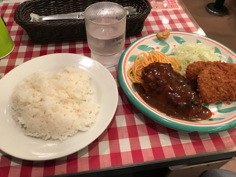 ハンバーグは厨房からパチパチ音がする、冷凍ではないちゃんとしたもの。