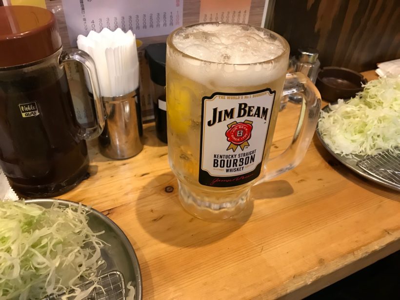 まずはメガハイボールでのどを潤し、お替り自由のキャベツの千切りを注文。