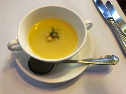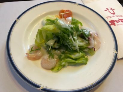 サラダの次にスープ、飲み終えるとステーキの登場。