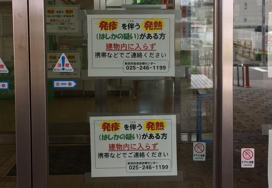 「はしかの疑いがある方は、入るな」の貼り紙。