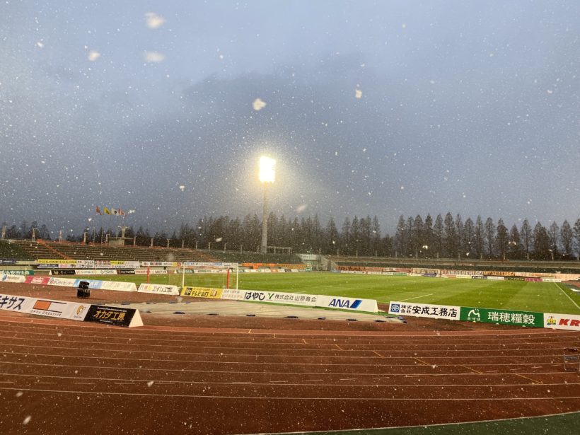 雪降る維新みらいふスタジアム。