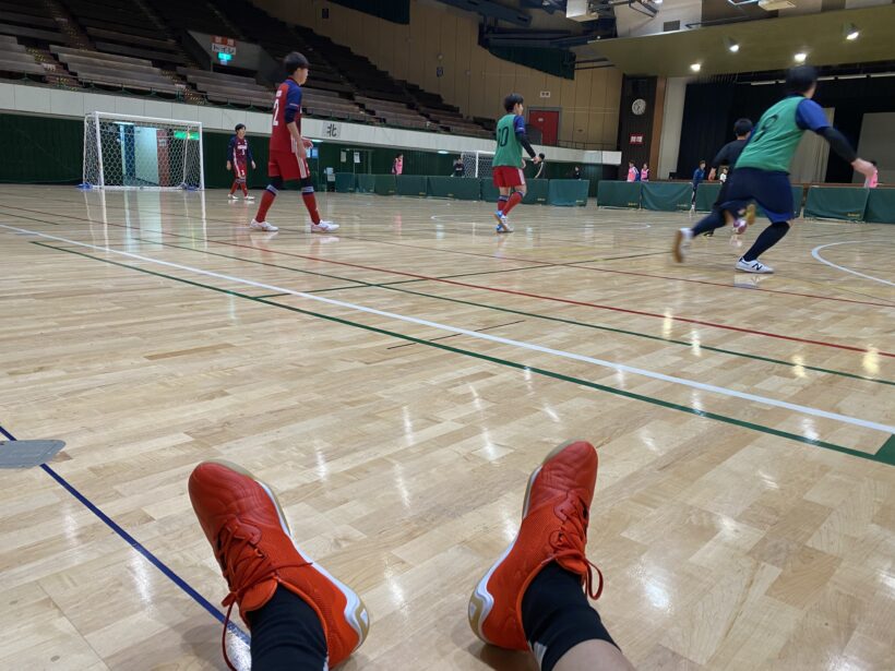 体育館用のフットサルシューズ(通常サルシュー)でやります。
