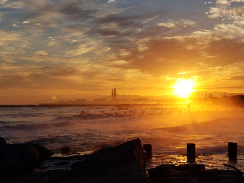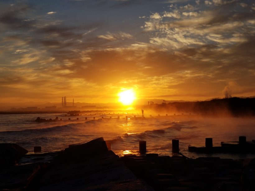 美しき朝焼けと日本海の荒波、そして8月にしては肌寒い気温のためか海から立ち上る湯気が幻想的だねの図。