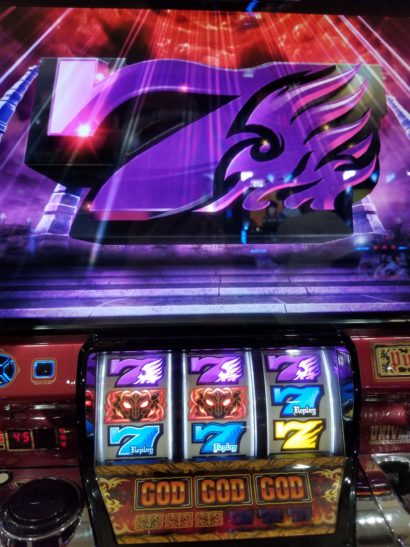 期待マンマンでリールを止めるも、GODとはならず紫7。