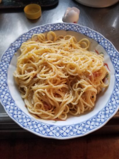 ・パルメザンチーズはよく卵と混ぜ合わせてからパスタに絡めよう。粉チーズ状のままパスタと絡めていったけれども、結局食べた時にボソボソとした食感が残ってしまってちょっと残念。滑らかでクリーミーにするためにはよく混ぜ合わせてからがいいね。