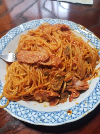 頑張ってパスタを炒めたつもりだったけど、ビビって全然。香ばしさゼロ。もっと大胆にしないとダメかしら。