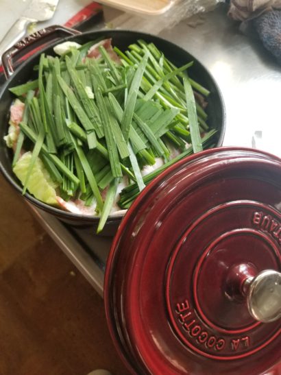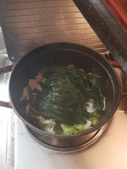 ただただレタスと豚肉を鍋にぶち込み軽く塩振って最後にニラを乗っけて火に掛けるだけだよの図