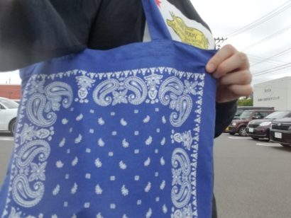 ペイズリー柄のトートバッグをエコバッグとして抱えてスーパーに入店してますの図