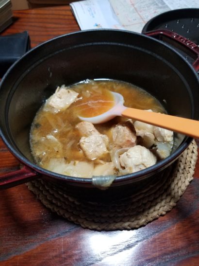 ストウブ鍋にてシンプルな鶏の無水鍋を作って出汁や醤油で味付けしーのの図