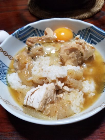 それをご飯にぶっかけーの卵をプラスをして親子丼風の雑炊にしてみたの図