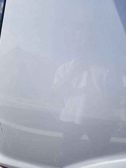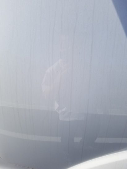 わかりずらいけど白いボディ特有の水垢?てきな黒い線がバッチリはいっているよの図