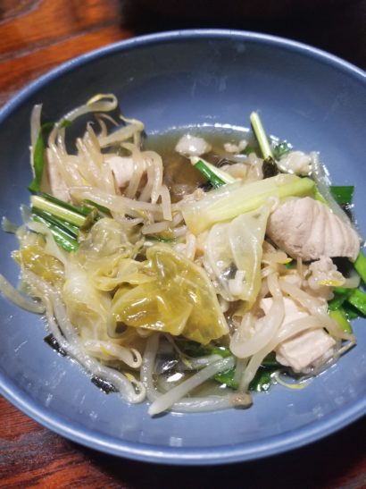 もつ500グラム、キャベツ、もやし、ニラで1000円くらい。