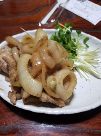 雑な盛りつけたけれども間違いなく豚の生姜焼きだよの図