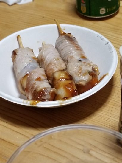 みたらし団子に豚バラを巻いて火を通したヤーツの図