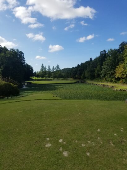 草が生えてわかりずらいけど池に囲まれたグリーンの名物ホールだよの図