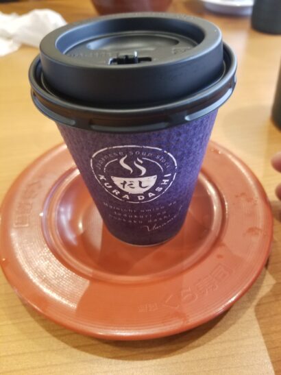 コーヒーのような容器でいただくくら寿司の出汁、略してくら出汁だよの図