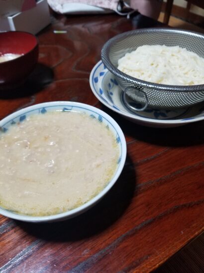鶏ひき肉もありクリーミーなのでまるで辛くない担々麺のようなつけダレだねの図