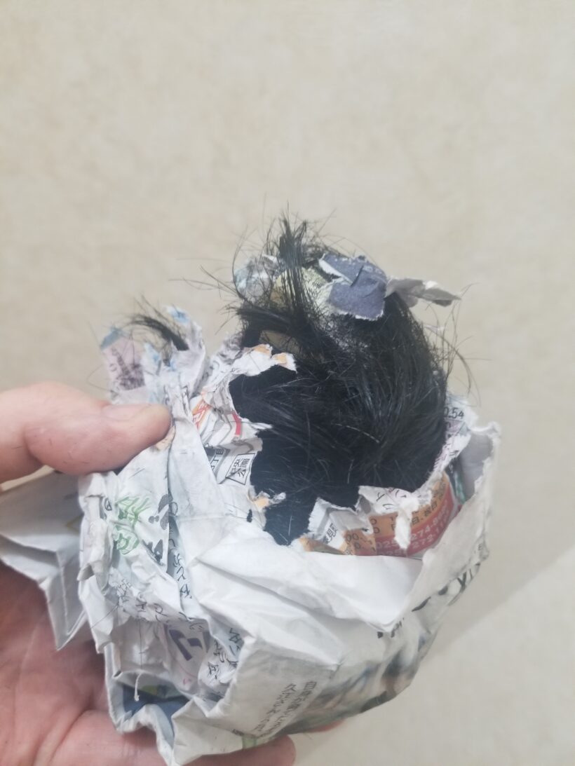 新聞紙を丸める際に切った髪の毛も一緒に丸めましょう。