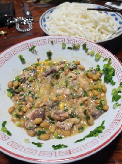 納豆、鯖の水煮、ネギ、めんつゆ、卵黄(めんどくさいから卵そのまま)入れてガッツリ混ぜるだけでつけ汁完成。