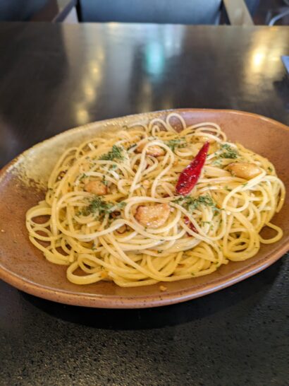 トッピングもニンニクと唐辛子だけというストロングスタイルのペペロンチーノだよの図