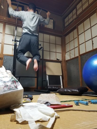 散らかってる部屋でオジサンが障子に向かって棒にぶら下がってる、ってゆー。