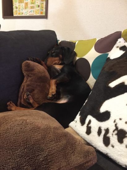 時には人間様をクッション代わりにして寝ています。