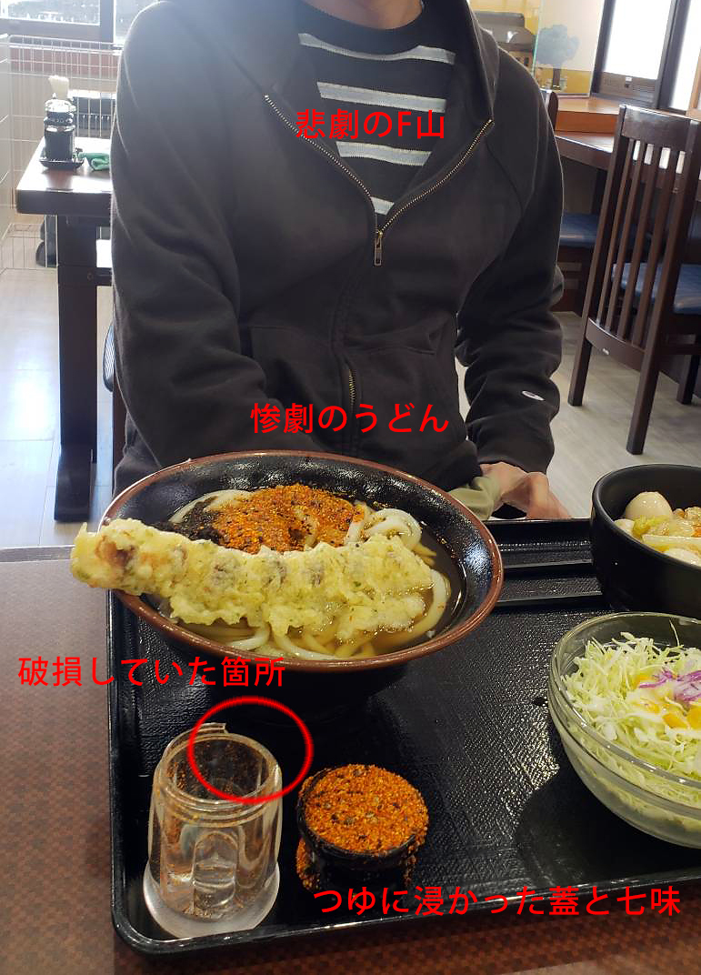 七味の蓋がふっとんで、蓋ごと七味を大量投入。というか、全量投入…