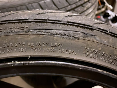 軽自動車に薄いタイヤを履かせていたので、段差等の衝撃に耐えられなかったのかもしれません。