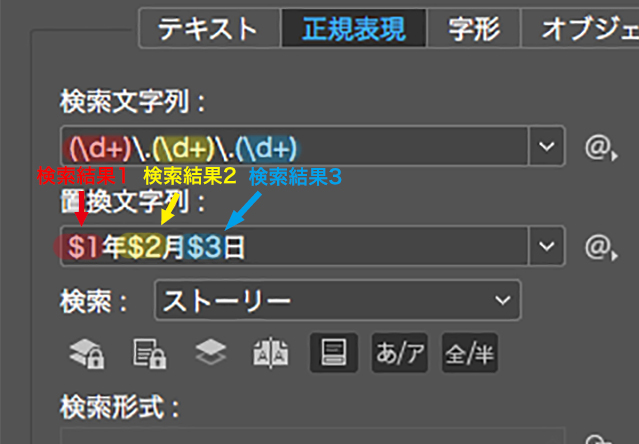 上の例だと、年にあたる数字が検索結果1、月が検索結果2、日が検索結果3です。