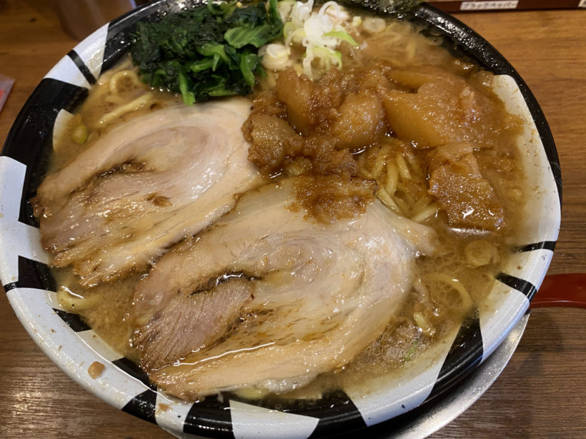 特濃豚ソバは、通常の豚ソバに背脂がトッピングされているとのことだったのですが、その背脂はまさかの塊でトッピングされていました。ビックリ!