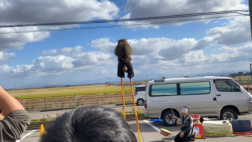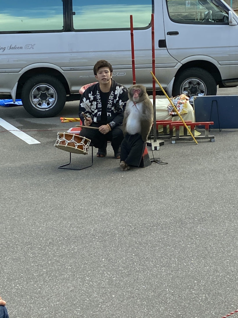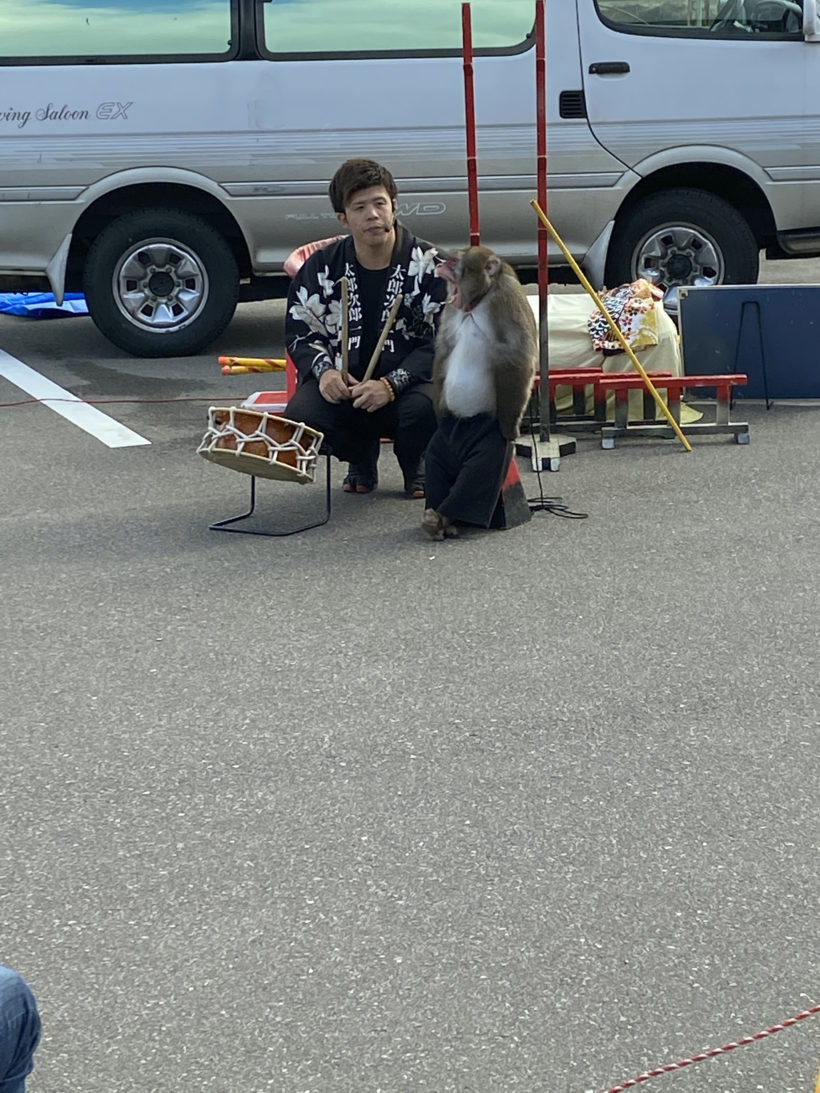 「なんだろう?」と思い、外に出てみると、猿回しっぽい光景が…。