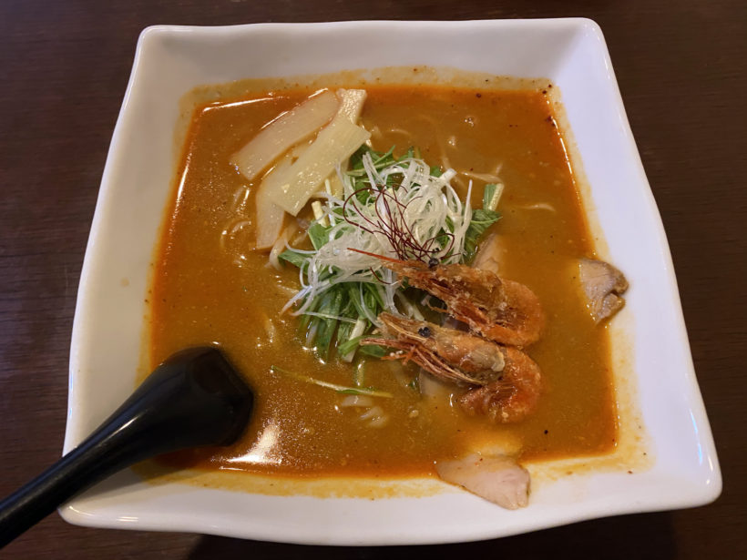 どうやらメニューをリニューアルしたようで、以前食べたときにはなかった、海老の唐揚げがトッピングされていました。