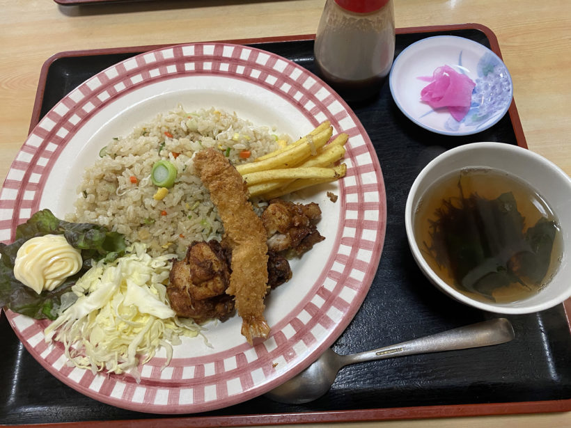チャーハンに唐揚げ・エビフライ・フライドポテト・キャベツ他とスープがついています。