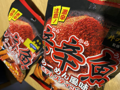 娘は買い物して帰ってきたようで、まさかの「辛辛魚らーめん風味ポテトスティック」ダブリという…。
