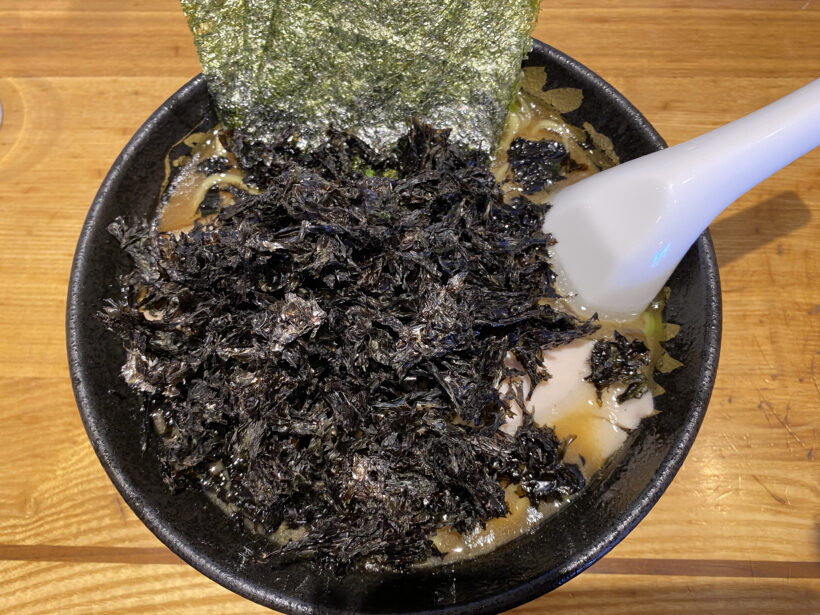 「岩のりラーメン」というだけあって、丼を覆い尽くさんほどの、大量の岩のりがトッピングされています。
