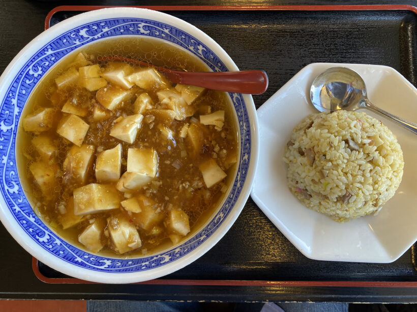 F山は「麻婆メン」と、ラーパス特典を使って半チャーハンを注文しました。