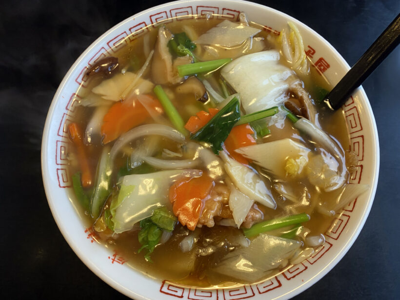 海龍に行くと決まってから、頭の中はずっと「五目あんかけ焼きそばを食べる」モード全開だったのですが、お店に入ってメニューとにらめっこして熟考した結果が、「うま煮らーめん」です。