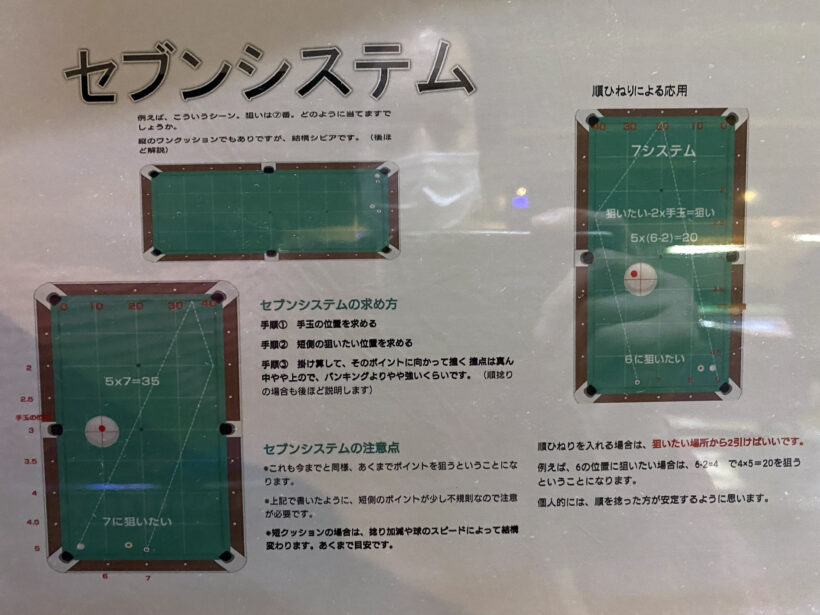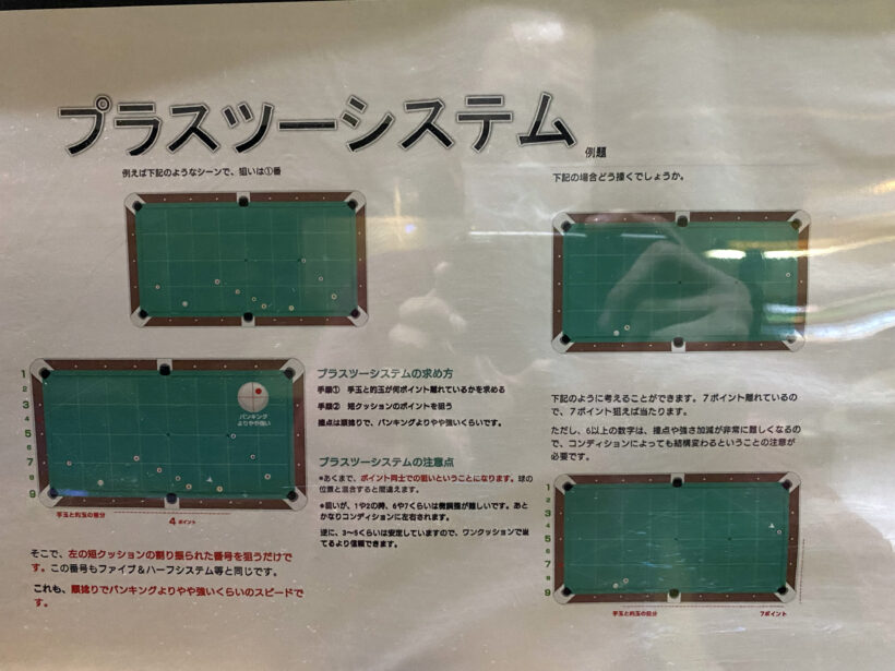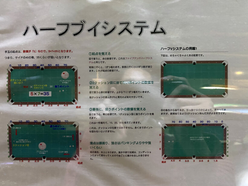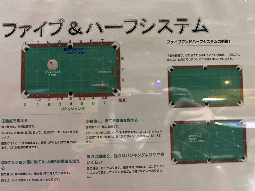 ちなみにクッションにシステムというのは、的球が隠れていて手玉を直接当てることができないときに、クッションを使って的球に当てるときの計算方法みたいなものです。