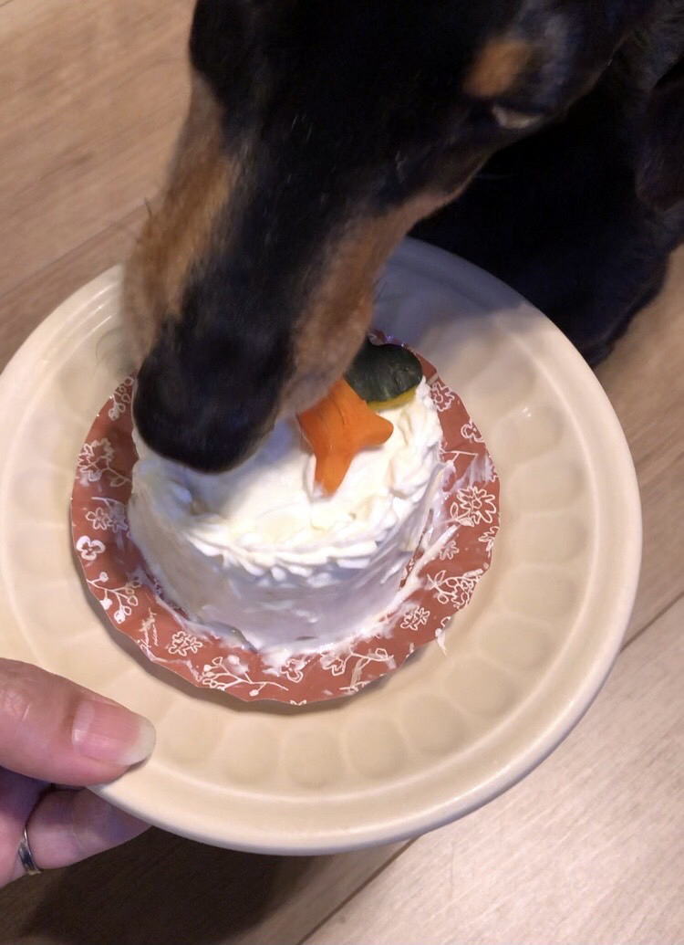 この「お誕生日ケーキっぽい何か」をムシャムシャと食す、こはく様。