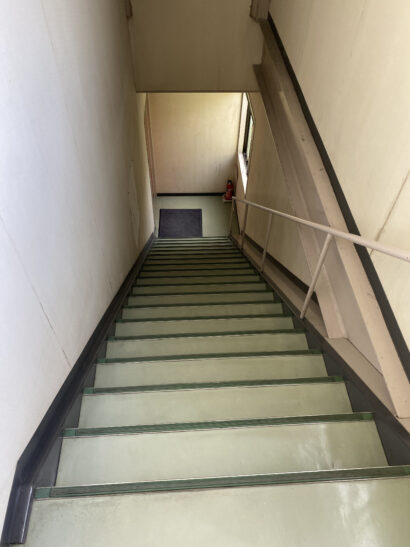 表階段は幅が広めなのでよかったのですが、画像の裏階段は幅が狭く、大勢で紙を運んで行き来するには少し危険が伴います。