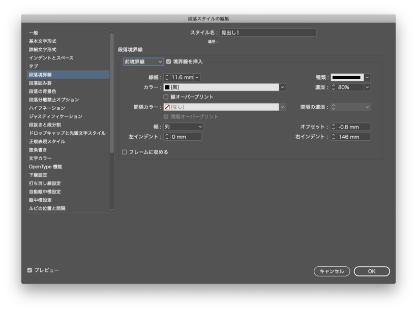 見出しの頭にある数字の黒い色帯を、「前境界線」で設定していきます。