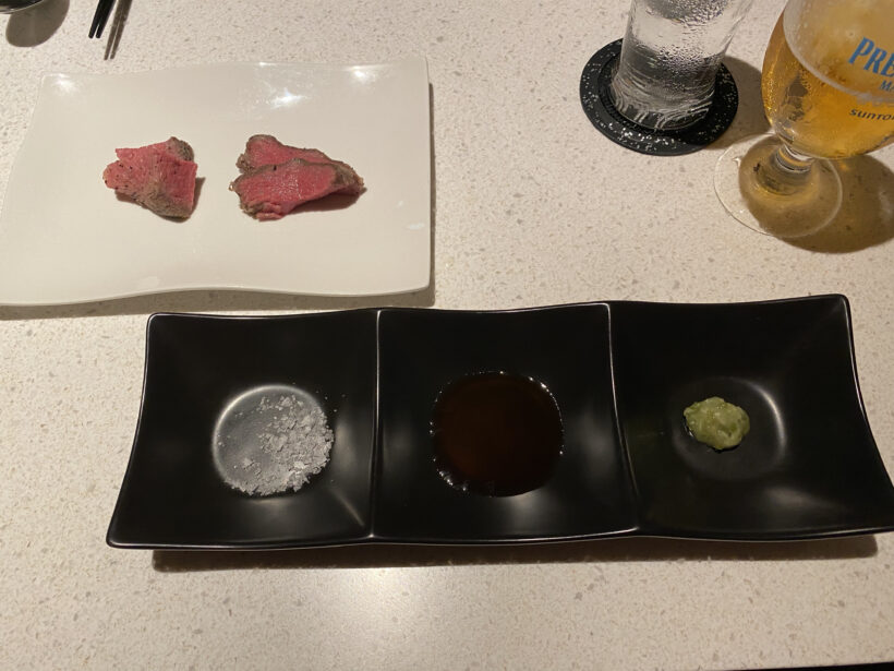 画像下の左が岩塩、中央がポン酢、右が刻みワサビ。