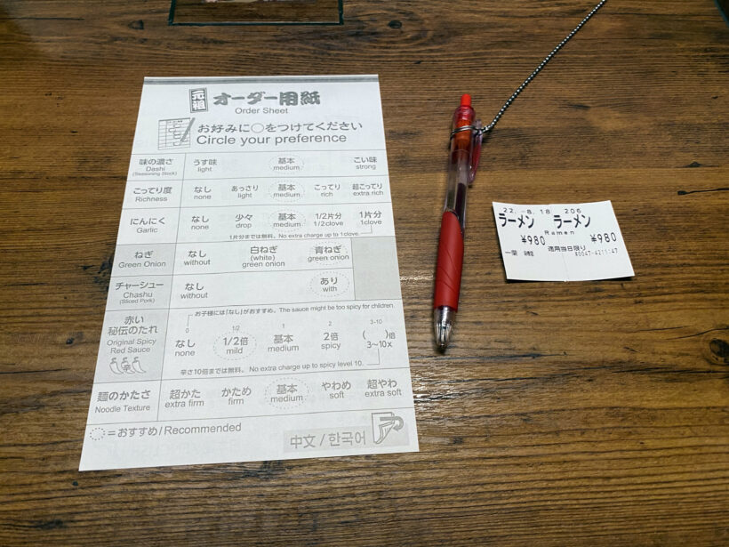 席に着いて、オーダー用紙を記入します。