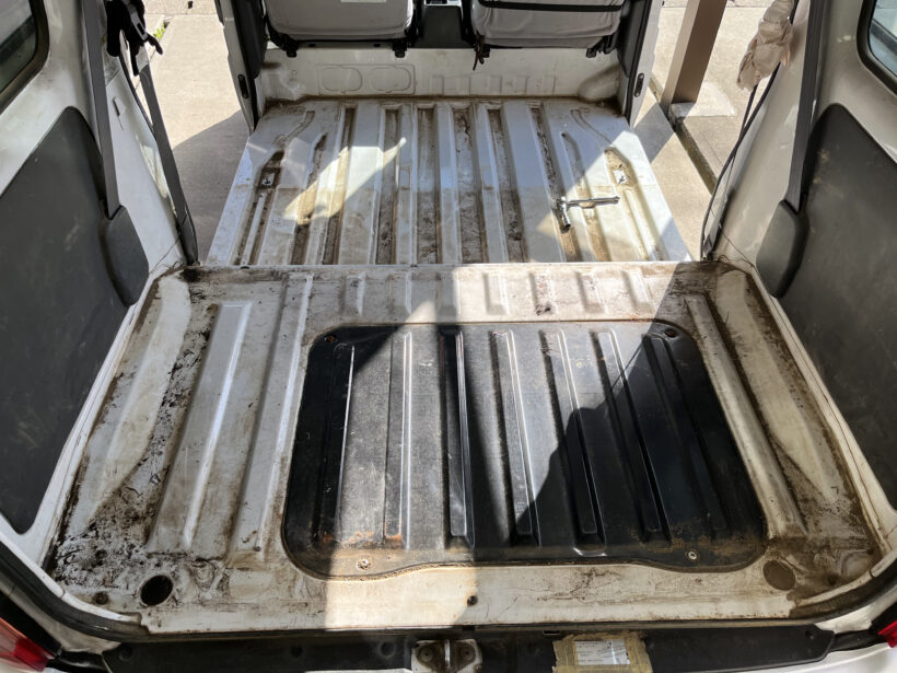 サンバーさんのリア側のフロアマットを取り外して掃除しましたが、フロアマット除去後の車内はガッツリと汚れていました。