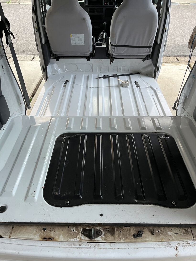 通常のクルマではまずやらないと思いますが、軽バンのフロアは簡単に鉄板むき出しになるので、がんがん水をかけて洗い流していきます。