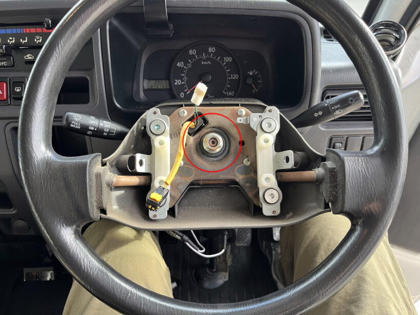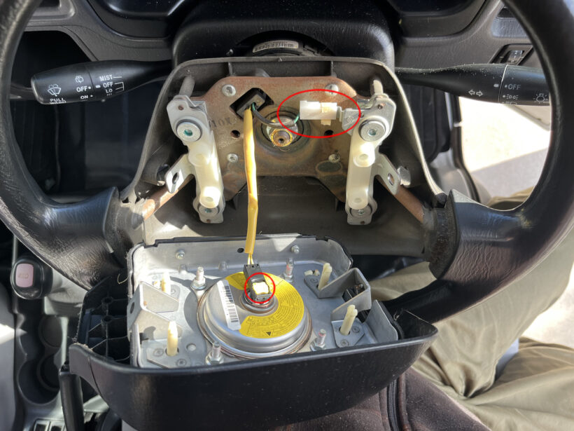 下の赤丸はエアバックの配線で、赤丸部分の黄色いカバーみたいなのを細いマイナスドライバーとかで上に持ち上げてから、カプラーを引っ張れば外れます。