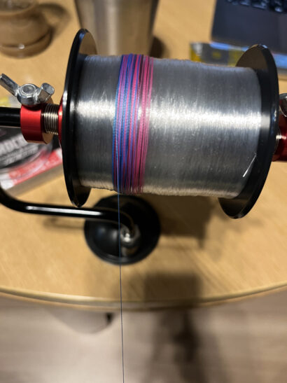 この状態だとPEラインが上に、下巻きのナイロンラインが下に来てしまうので、別のボビンにもう一度巻き直します。
