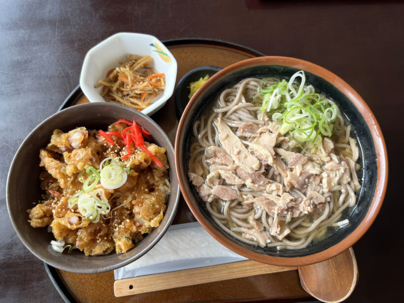 肉そばと、げそ天を細かく刻んだ丼(たぶん「ミニソースげそ天丼」)のセットです。