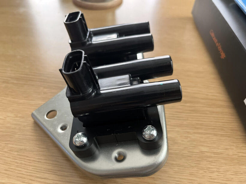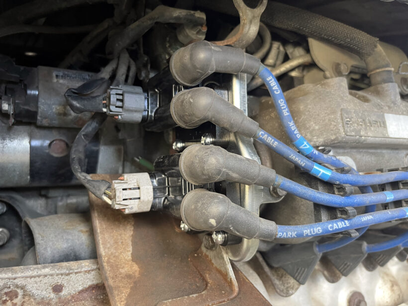 プラグコードにつながっているイグニッションコイルの下側から電気がリークしていたので、イグニッションコイルを交換します。