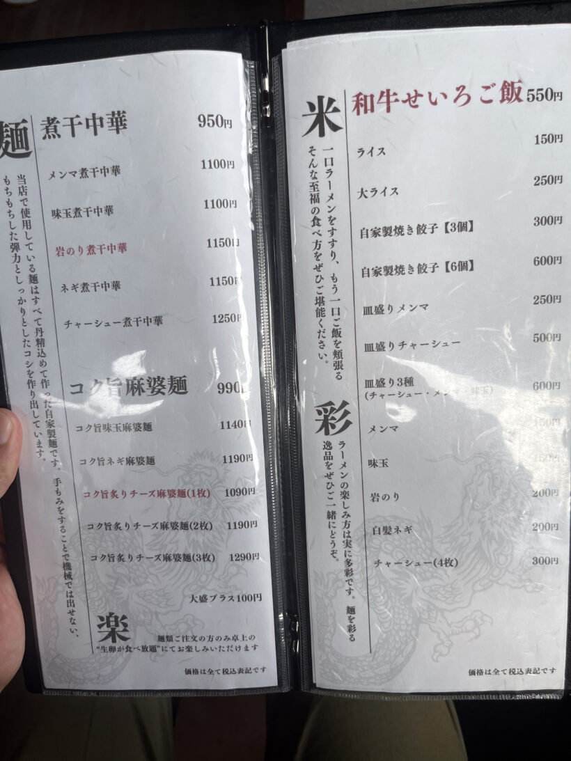 看板メニューと思われる「煮干中華」にするか、「コク旨麻婆麺」にするか、非常に悩みます。